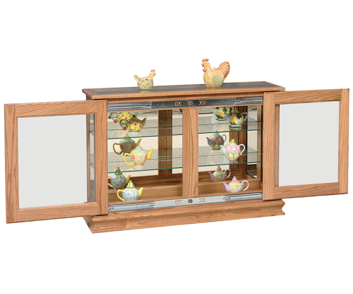 Features: • Glass top • Mirror back • Two adjustable glass shelves with plate groove