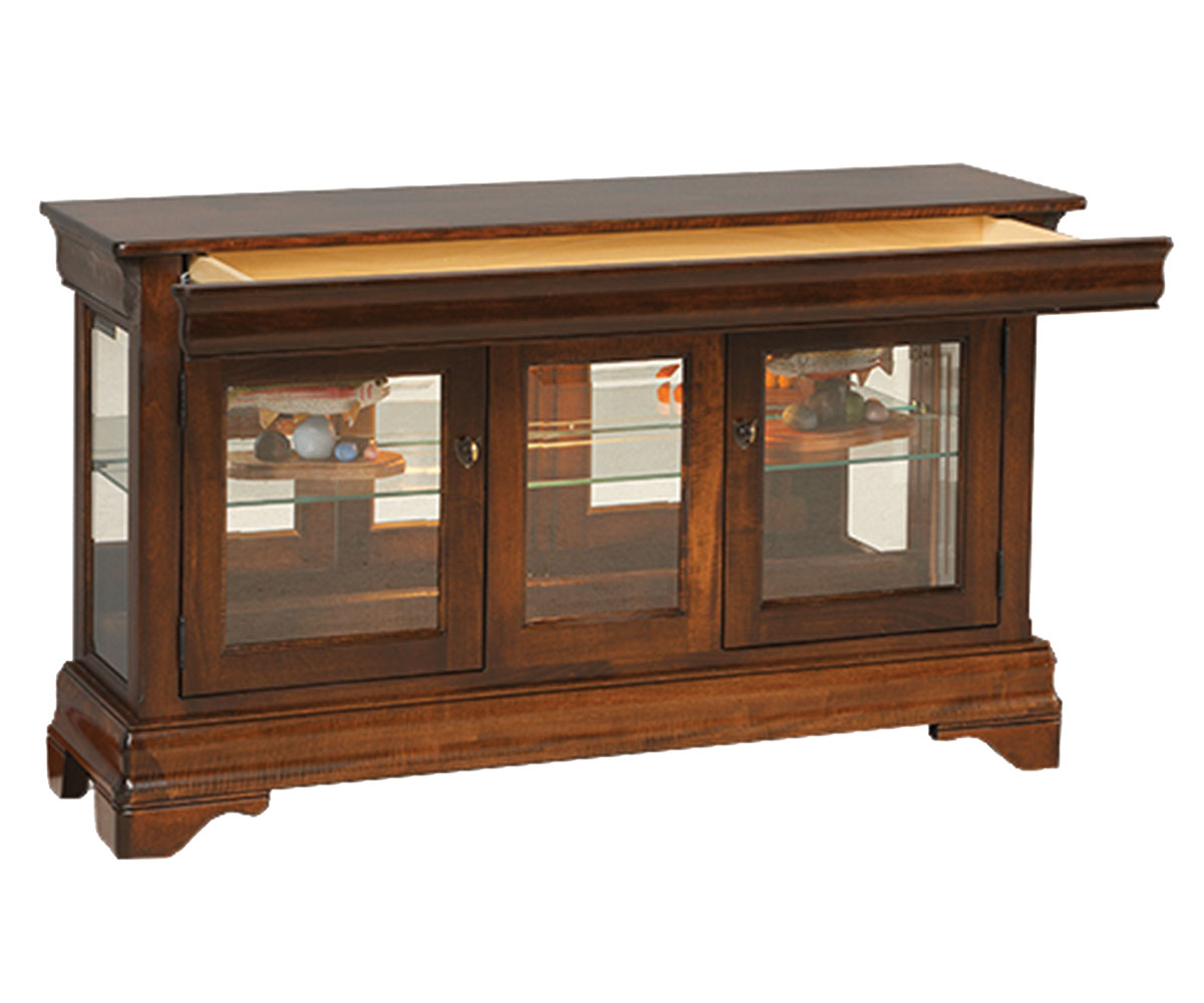 Features: • Hidden drawer in the top molding • LED touch light in top of cabinet • Mirror back • Two adjustable glass shelves with plate grooves
