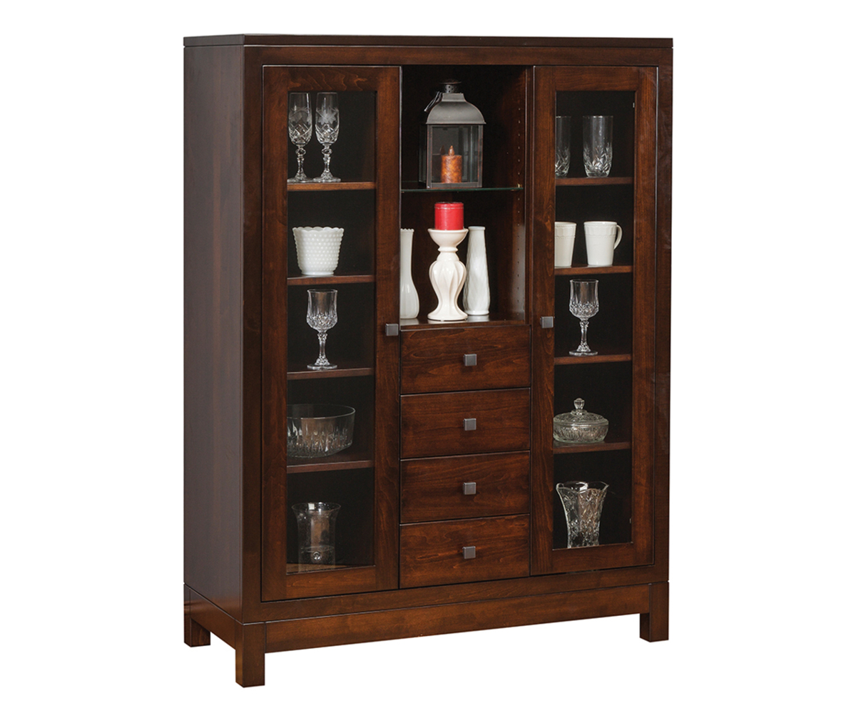 Features: • Four adjustable wood shelves behind doors • One adjustable glass shelf in center • Dovetailed drawers • Full extension drawer slides