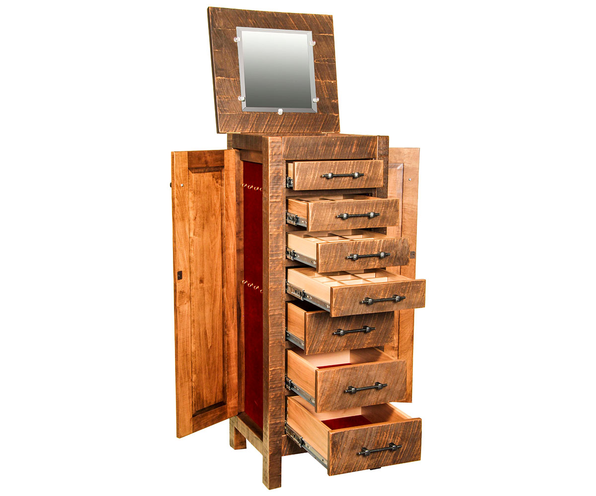 Features: • Black felt lined interiors • Top drawer is a ring drawer • Three divided drawers • Bottom drawers are all felt lined • Necklace storage behind the side door