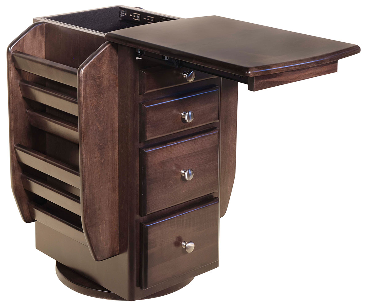 Features: • Dovetailed drawers • Pull out cupholder shelf • Magazine racks • Tissue holder • Pull out trash bin