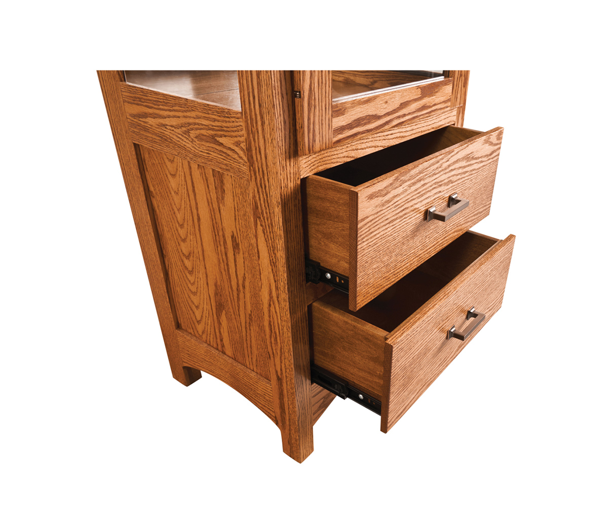 Features: • LED touch light in top of cabinet • Mirror back • Three adjustable glass shelves • Dovetailed drawers • Full extension drawer slides