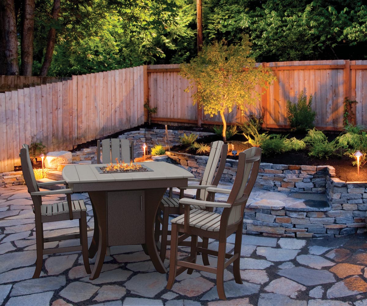 Features: • Firepit in the center • Created from poly lumber which is a recycled plastic • Designed to be out in all elements of weather • No maintenance such as staining required
