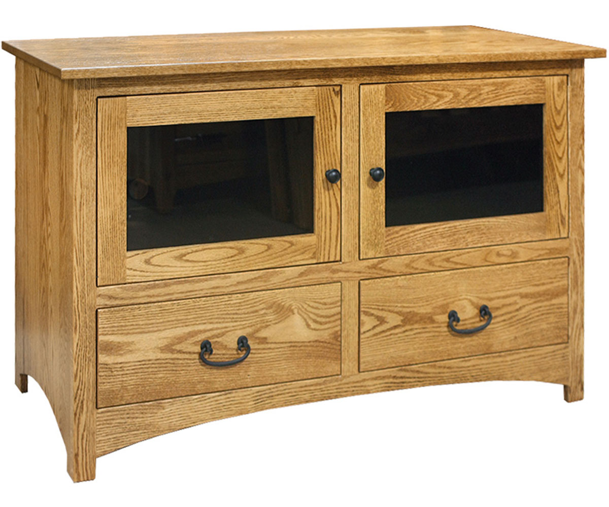 Features: • ¾” thick top • One adjustable shelf per opening • Smoked glass doors • Dovetailed drawers • Full extension drawer slides