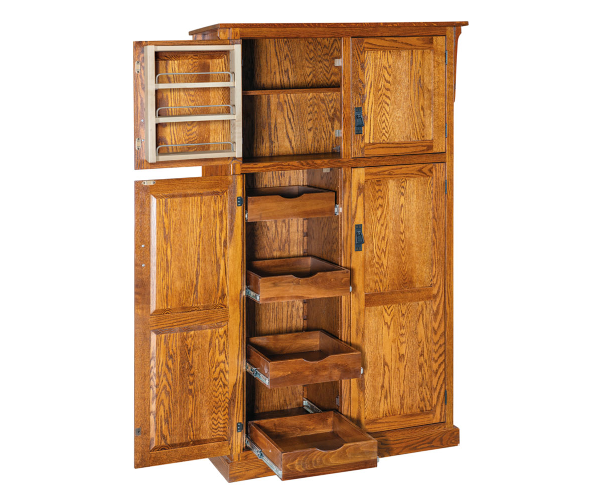 Features: • One adjustable shelf in the top • Spice rack in each top door • Four rollout shelves behind each door