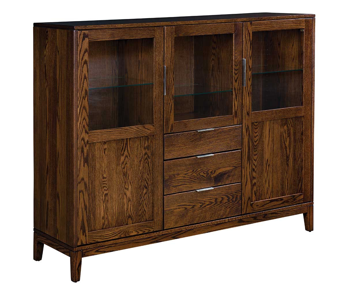 Features: • Lights above the glass shelves • One adjustable glass shelves behind each door • Dovetailed drawers with soft close drawer slides • Two adjustable shelves behind each wood panel