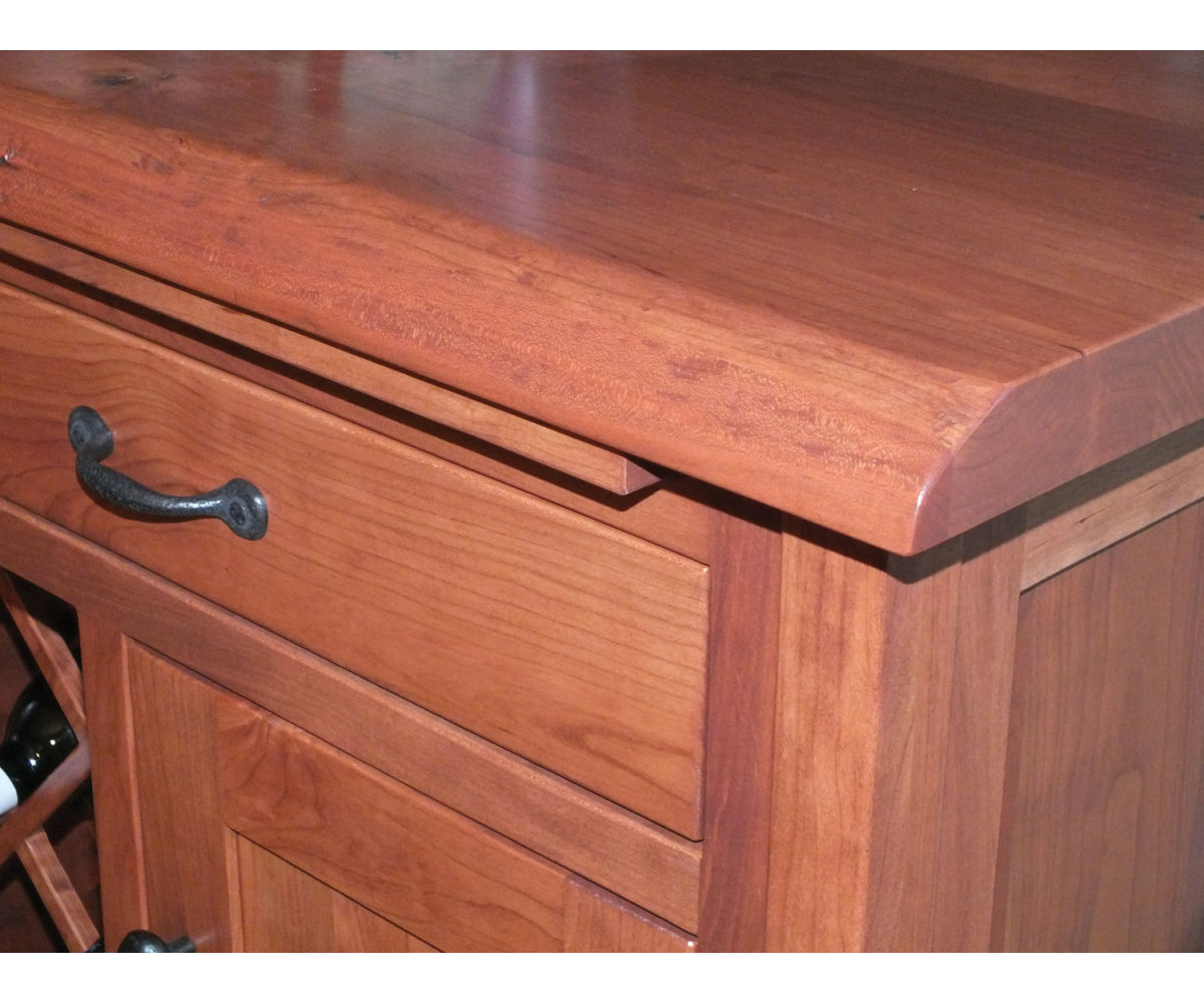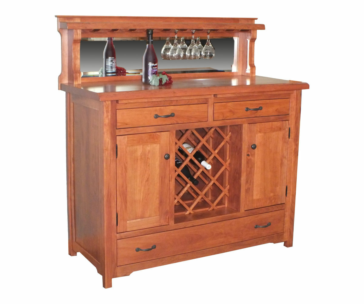Features: • Stemware on top hold up to ten glasses • Beveled mirror back • 1½” thick hand-cut top • Pullout server shelves above the drawers • Dovetailed drawers • One shelf behind each door • Bottle rack in the center